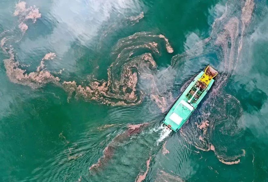 △垃圾清理船在貴州黔西市烏江源百里畫廊江面上清理垃圾(2022年6月2日攝)。