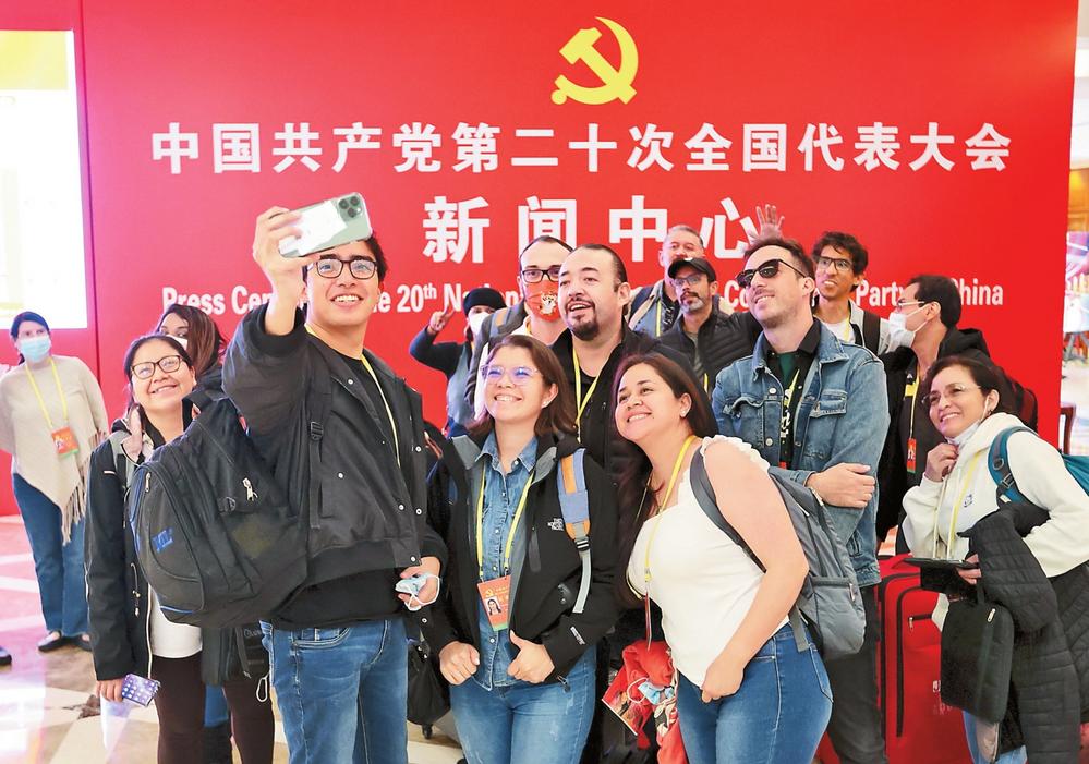 境內(nèi)外記者在黨的二十大新聞中心合影。本報(bào)特派記者 周燦 雷桐蘇 攝