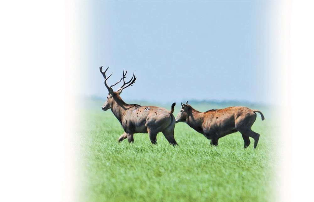 一頭體型較大的母麋鹿,帶著一頭小麋鹿正在食草。一陣簌簌聲響,母麋鹿頗為機(jī)警,不時(shí)抬頭張望,幾聲低鳴。