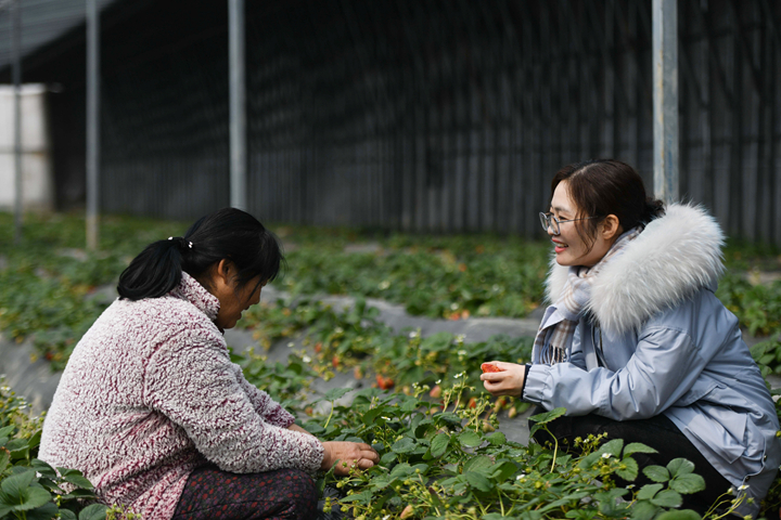 2月22日,在安徽省滁州市定遠縣吳圩鎮(zhèn),王萌萌(右)與草莓種植戶交流。新華社記者 張端 攝