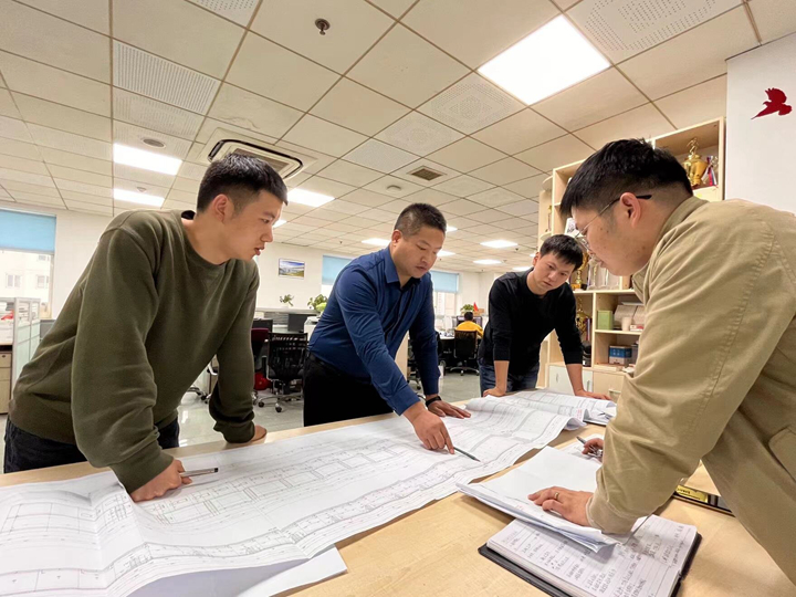 徐斌(左二)和同事在討論設(shè)計方案。2022年10月攝于中鐵第一勘察設(shè)計院。