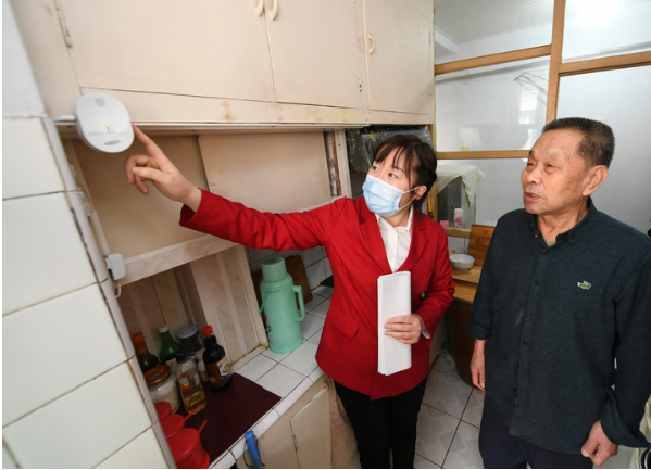 吉林省長春市長山花園社區(qū)黨委書記韓麗萍(左)到獨居老人家中檢查燃氣報警設(shè)備(資料照片)。新華社發(fā)