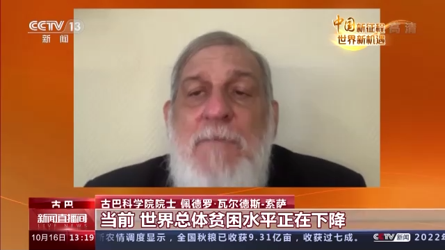 古巴科學(xué)院院士 佩德羅·瓦爾德斯-索薩:當(dāng)前,世界總體貧困水平正在下降,世界貧困人口正在減少,正是由于中國共產(chǎn)黨、中國政府和人民的努力,讓如此規(guī)模的人口在短時間內(nèi)擺脫了貧困,這無疑要歸功于中國共產(chǎn)黨的領(lǐng)導(dǎo)。
