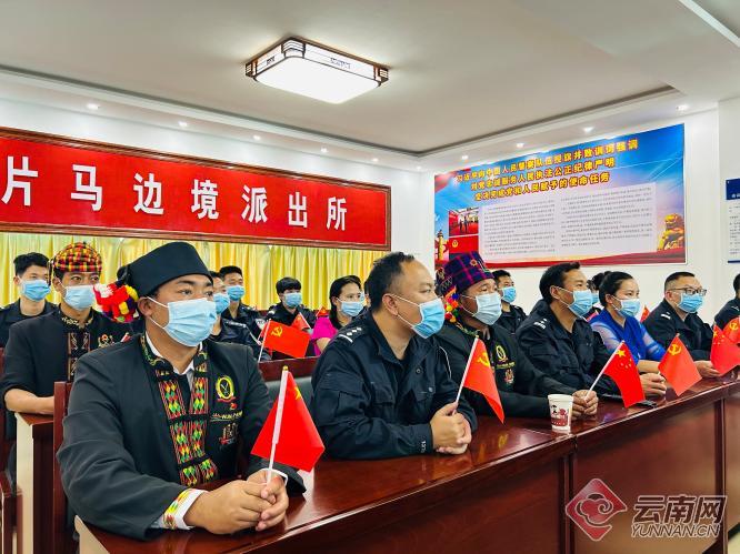 10月16日上午10時,在怒江邊境管理支隊片馬邊境派出所的學(xué)習(xí)室里,全體民警、輔警與轄區(qū)傈僳族、景頗族、彝族等少數(shù)民族同胞揮舞著黨旗和國旗,一起收聽收看黨的二十大開幕會盛況。