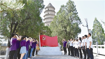 黨員在陜西延安市寶塔山重溫入黨誓詞。新華社記者 ?張博文攝