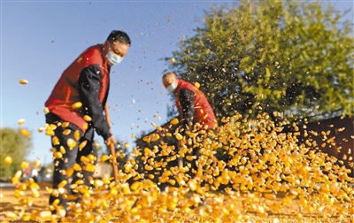 新疆塔城市闊克加依達克村的黨員干部、駐村工作隊隊員組成志愿服務隊,幫助村民翻曬玉米。文博攝(影像中國)