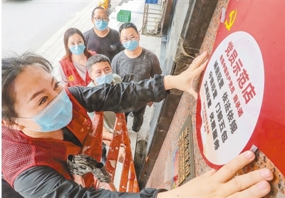 河北秦皇島市海港區(qū)東環(huán)路街道東環(huán)北里社區(qū)工作人員為“黨員示范店”商戶掛牌。曹建雄攝(影像中國)