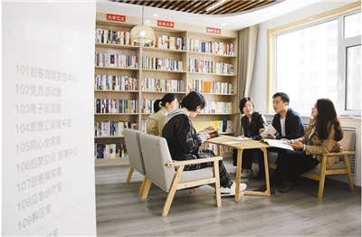 山東濱州市一處黨群服務中心內(nèi),大學生們在交流學習心得。初寶瑞攝(影像中國)