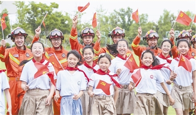 江蘇淮安市生態(tài)文旅區(qū)消防救援指戰(zhàn)員與學生們聯(lián)合開展主題黨日活動。趙啟瑞攝(人民視覺)