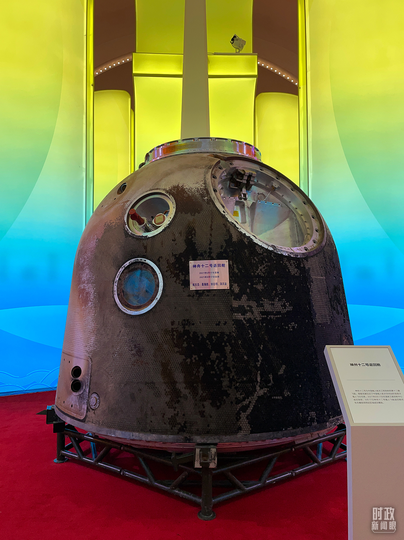 △“奮進(jìn)新時(shí)代”主題成就展上,神舟十二號(hào)返回艙展示。(總臺(tái)央視記者彭漢明拍攝)