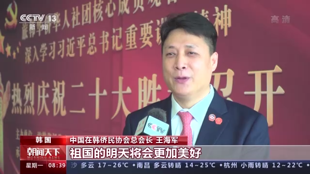 中國(guó)在韓僑民協(xié)會(huì)總會(huì)長(zhǎng) 王海軍:我們堅(jiān)信,二十大后,中國(guó)的發(fā)展道路會(huì)更加寬廣,祖國(guó)的明天會(huì)更加美好。作為生活在韓國(guó)的華僑華人,我們將緊緊跟隨祖國(guó)的堅(jiān)定步伐,為實(shí)現(xiàn)祖國(guó)統(tǒng)一和民族偉大復(fù)興,作出無(wú)愧于時(shí)代的貢獻(xiàn)。