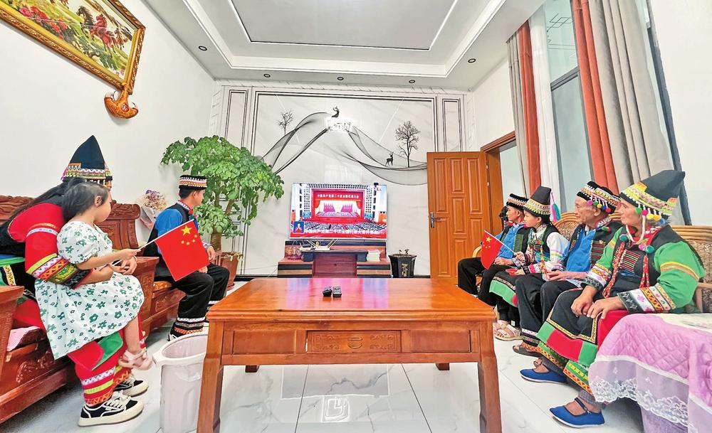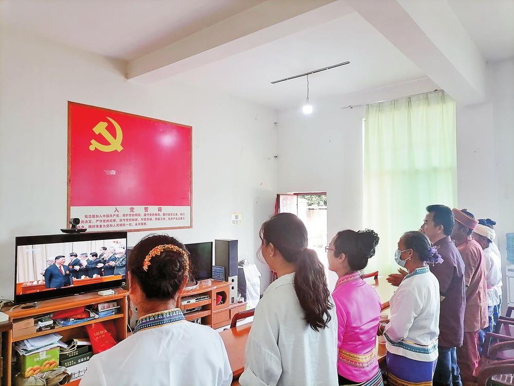 昌寧縣卡斯鎮(zhèn)卡斯社區(qū)布朗族群眾收看開幕會直播