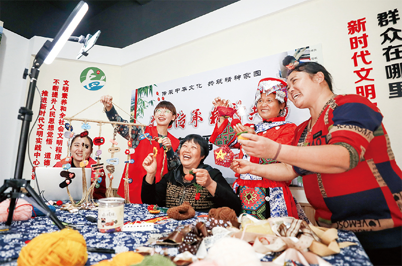 2021年10月27日,浙江省湖州市長興縣虹星橋鎮(zhèn)畢家村在新時代文明實踐站開展“文化傳承,精神共富”直播帶貨活動。該村以“黨建+”的形式,帶領(lǐng)村民一起制作手工藝品,學習電商、直播等線上營銷網(wǎng)絡(luò)新技能,提升村民就業(yè)技能,助力共同富裕。圖為青年黨員志愿者和村民一起直播帶貨?!∏笫菆D片 陸一平/攝