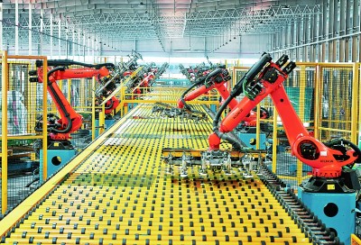 福建省一家企業(yè)的汽車玻璃生產(chǎn)車間內(nèi),機(jī)械手在生產(chǎn)線上作業(yè)(2021年攝)。新華社發(fā)