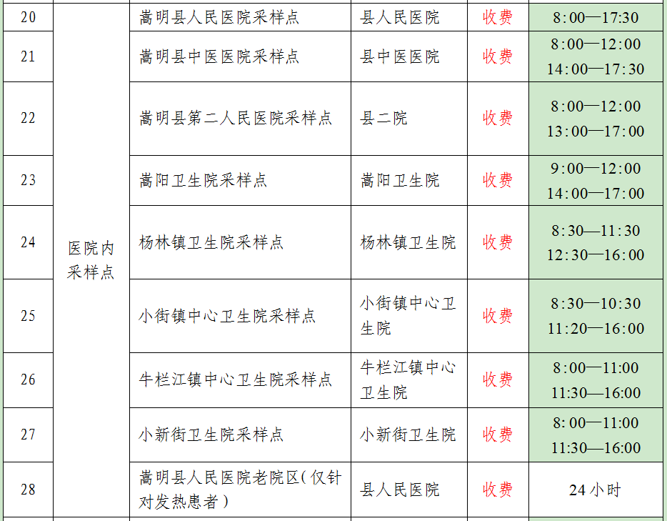 為進(jìn)一步優(yōu)化常態(tài)化核酸檢測(cè)點(diǎn)位設(shè)置和社會(huì)面日常核酸篩查,加強(qiáng)采樣點(diǎn)位精細(xì)化、標(biāo)準(zhǔn)化管理,保障采樣人員和群眾安全,現(xiàn)對(duì)全縣28個(gè)核酸采樣點(diǎn)進(jìn)行調(diào)整優(yōu)化,其中免費(fèi)核酸檢測(cè)點(diǎn)位按照“愿檢盡檢”原則,于工作時(shí)間對(duì)群眾開展免費(fèi)核酸檢測(cè)。