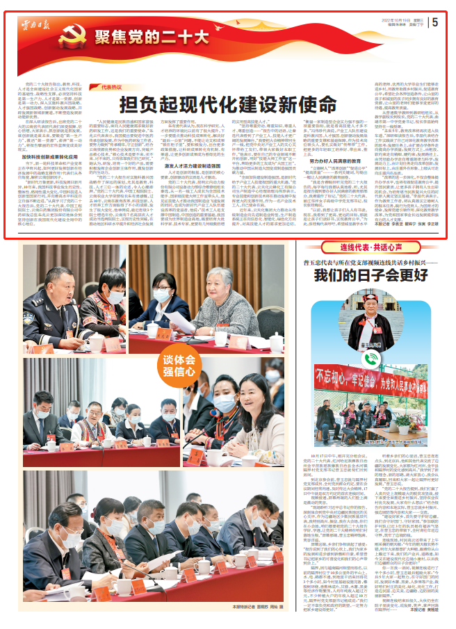 在深入研讀報(bào)告后,出席黨的二十大的云南省代表團(tuán)代表們深受鼓舞、信心倍增。大家表示,抓創(chuàng)新就是抓發(fā)展,謀創(chuàng)新就是謀未來,要鍛造“第一生產(chǎn)力”,激活“第一資源”,澎湃“第一動力”,將報(bào)告擘畫的宏偉藍(lán)圖變成美好現(xiàn)實(shí)。