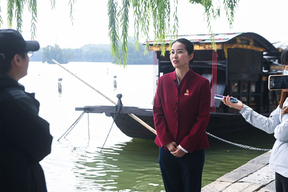 10月16日,在浙江省嘉興市,南湖革命紀(jì)念館講解員張一在接受采訪。新華社記者 徐昱 攝