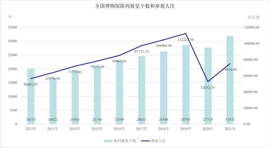 十年來(lái),全國(guó)博物館不斷優(yōu)化服務(wù)效能,參觀服務(wù)人次穩(wěn)步提升。2021年,全國(guó)博物館陳列展覽31931個(gè),比2012年增長(zhǎng)58.7%;參觀人次74850.45萬(wàn),比2012年增長(zhǎng)32.7%。