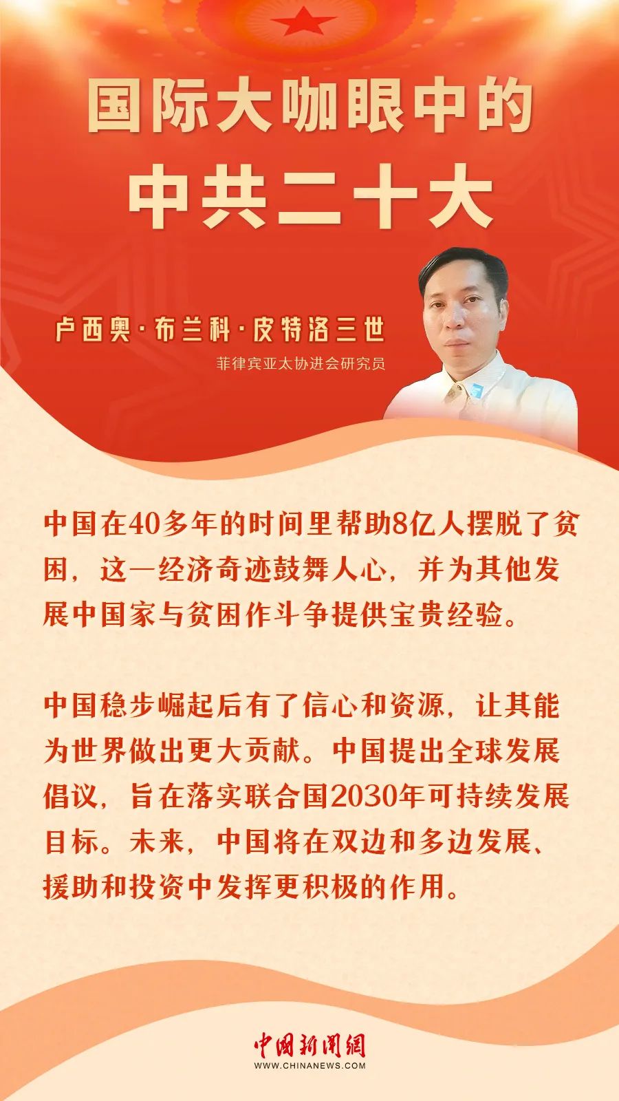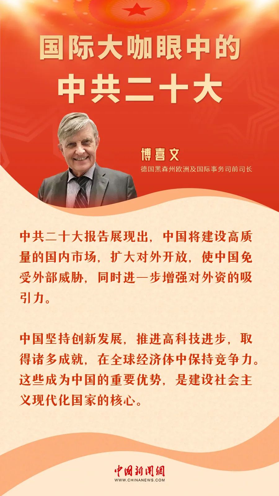 如何看待“中國式現(xiàn)代化”?中共二十大釋放出事關(guān)中國未來發(fā)展方向的何種信號?為什么說中共二十大將提供當(dāng)今世界所亟需的確定性和穩(wěn)定性?中國新聞網(wǎng)特別策劃“國際大咖眼中的中共二十大”,傳遞國際社會對正在舉行的中共二十大的精彩評論——