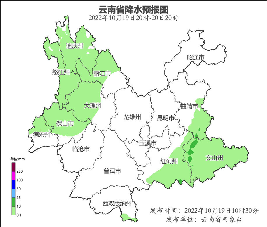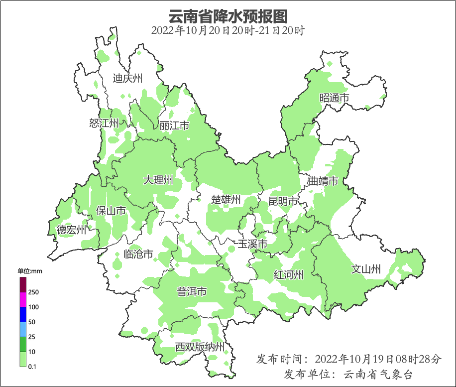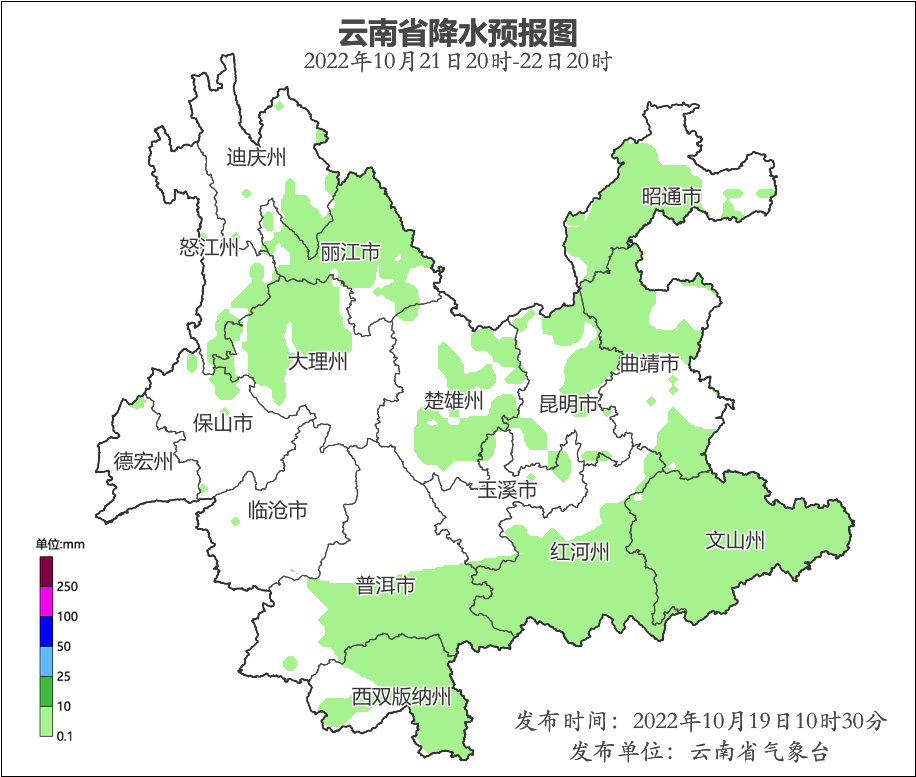 10月20日迪慶、怒江、麗江西部、大理北部、保山西部、德宏西部、昭通北部、曲靖、文山、紅河有陣雨局部中雨,需注意防范前期累計(jì)降水和持續(xù)性降水可能引發(fā)的次生災(zāi)害。另外,滇西南清晨局地有大霧,需注意出行安全。