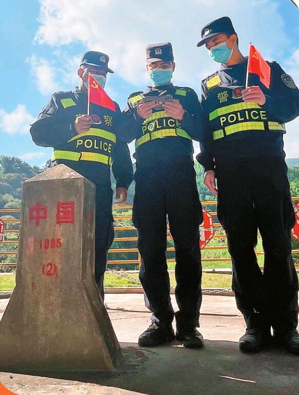 “走嘍,巡邏去!”一大早,隴把邊境派出所民警李穆叫上隊友黃柱,向著44號界樁處走去。李穆和隊友手里拿著黨旗,用手機觀看黨的二十大開幕會盛況。當國歌響起,李穆和黃柱不約而同面向北京方向,莊嚴敬禮。