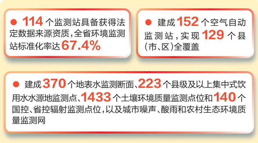 截至目前,全省114個(gè)監(jiān)測(cè)站通過(guò)檢驗(yàn)檢測(cè)機(jī)構(gòu)資質(zhì)認(rèn)定,具備獲得法定數(shù)據(jù)來(lái)源的資質(zhì)。全省環(huán)境監(jiān)測(cè)站的標(biāo)準(zhǔn)化率為67.4%,較“十三五”初期提高了16.8%;370個(gè)地表水監(jiān)測(cè)斷面、223個(gè)縣級(jí)及以上集中式飲用水水源地監(jiān)測(cè)點(diǎn)、1433個(gè)土壤環(huán)境質(zhì)量監(jiān)測(cè)點(diǎn)位和140個(gè)國(guó)控、省控輻射監(jiān)測(cè)點(diǎn)位,以及城市噪聲、酸雨和農(nóng)村生態(tài)環(huán)境質(zhì)量監(jiān)測(cè)網(wǎng);建成152個(gè)空氣自動(dòng)監(jiān)測(cè)站,實(shí)現(xiàn)129個(gè)縣(市、區(qū))全覆蓋。