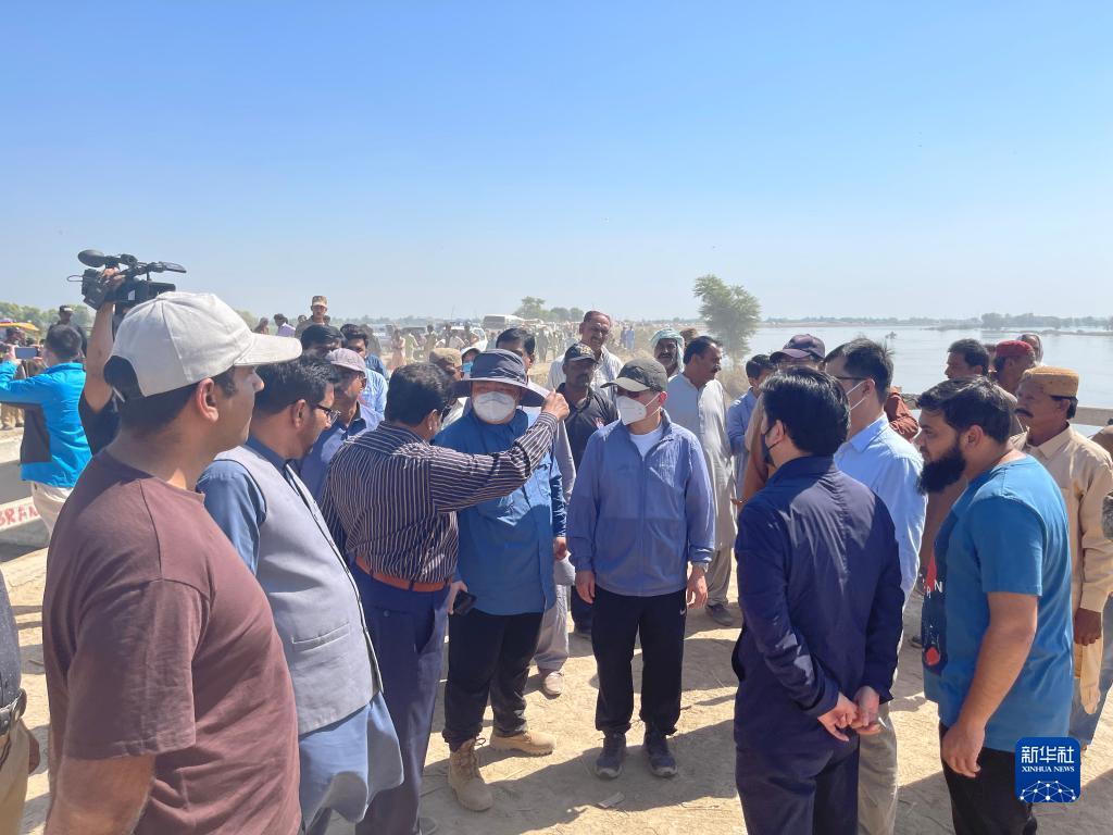 10月16日,中國政府防洪專家組在巴基斯坦南部信德省達杜地區(qū)考察洪災災情。新華社記者 姜江 攝