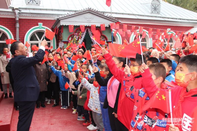 塔城市新城街道哈爾墩社區(qū)居民沙勒克江·依明在自家小院里同各族群眾一起升國旗,唱愛國主義歌曲。通訊員 馬合巴勒·木爾扎汗攝