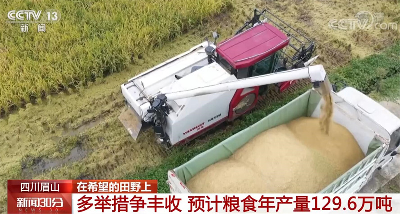 眼下,四川眉山的149萬畝水稻也迎來豐收。今年,當(dāng)?shù)赝ㄟ^采取引水澆灌等措施力爭秋糧豐收,預(yù)計(jì)全年糧食產(chǎn)量129.6萬噸,比上年增長1.6%。