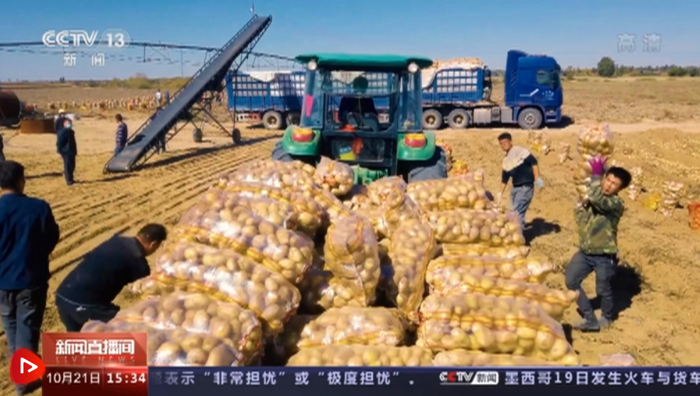 央視網(wǎng)消息:秋意濃、豐收忙。眼下,陜西榆林200多萬畝馬鈴薯相繼成熟,進入收獲期。在靖邊縣黃蒿塘村的千畝高標準馬鈴薯示范種植基地里,馬鈴薯收獲機來回穿梭,將土壤中的馬鈴薯分離出來,村民們則忙著撿拾裝袋,進行包裝,隨后運往各地銷售。據(jù)了解,靖邊縣沙壤土透氣好、晝夜溫差大、光照充足,適宜馬鈴薯生長。