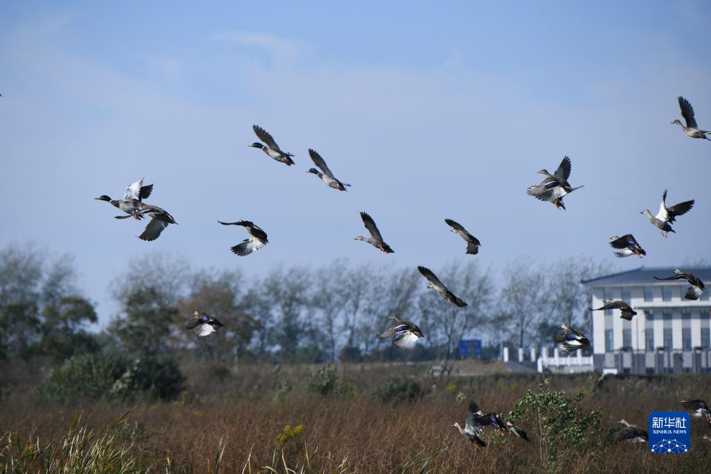 10月20日,鳥兒在十八聯(lián)圩濕地上空飛舞。