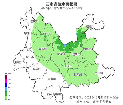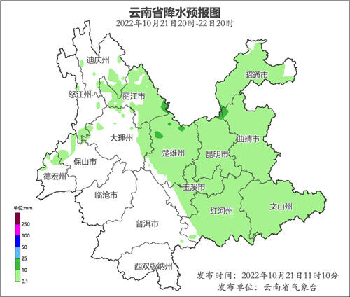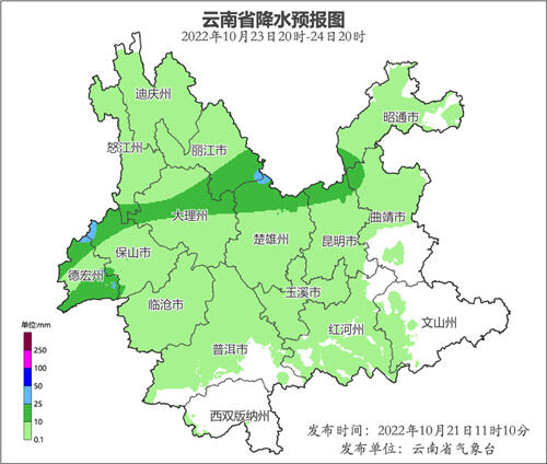 10月22日20時到10月23日20時:昭通南部、曲靖北部、昆明北部、楚雄北部、麗江東南部陰有小到中雨局部大雨,昭通北部、文山東部、迪慶西部、怒江西部、保山、德宏、臨滄、普洱、西雙版納多云間陰,其它地區(qū)陰天間多云有小雨。
