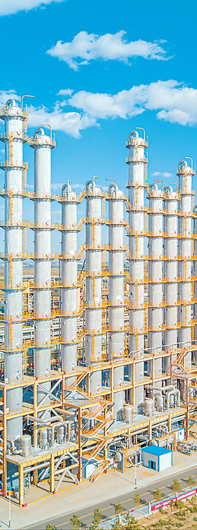 內(nèi)蒙古通威高純晶硅有限公司廠區(qū)里的精餾塔。 |
