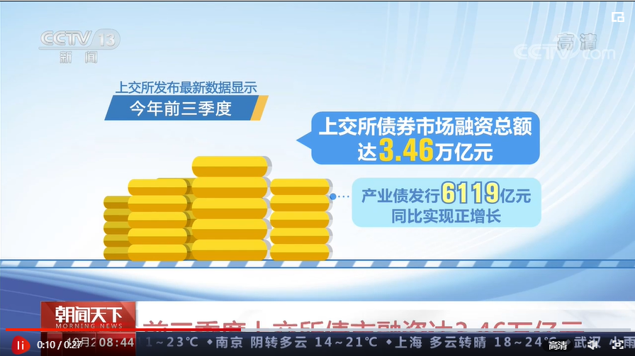 央視網(wǎng)消息:上交所發(fā)布最新數(shù)據(jù)顯示,今年前三季度,上交所債券市場(chǎng)融資總額達(dá)3.46萬(wàn)億元,其中,產(chǎn)業(yè)債發(fā)行6119億元,同比實(shí)現(xiàn)正增長(zhǎng)。1—9月,上交所產(chǎn)業(yè)債凈融資額為正,同比增長(zhǎng)200多億元。今年共有150余家產(chǎn)業(yè)企業(yè)自2015年以來(lái)首次在上交所申報(bào)或發(fā)行信用債。