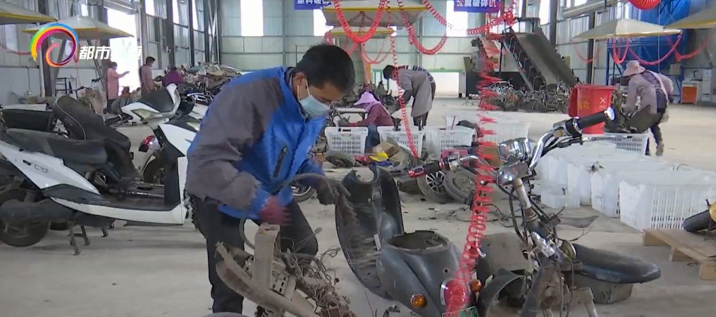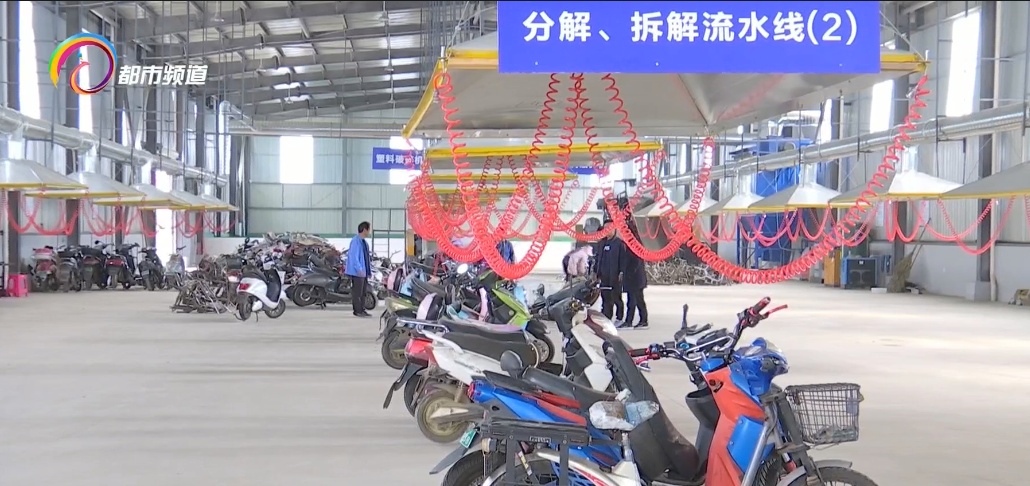 記者王正民說:“我們現(xiàn)在進入廠房里可以看到,這里有三條分解拆解流水線,目前,工作人員正在進行淘汰電動自行車的拆解,那我們現(xiàn)在就了解一下,一輛被淘汰的電動自行車是如何進行拆解的?!?/p>
