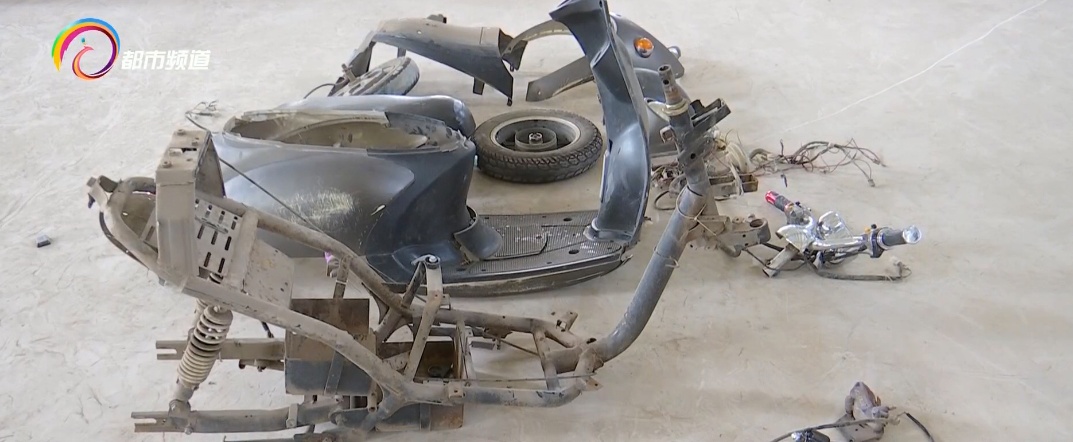 云南有功再生資源有限公司拆解廠廠長吳喜獻說:“把座桶提下來,整個外殼卸掉,然后再拆電機、總成線、前輪子,那這個車基本上就拆解完畢?!?/p>