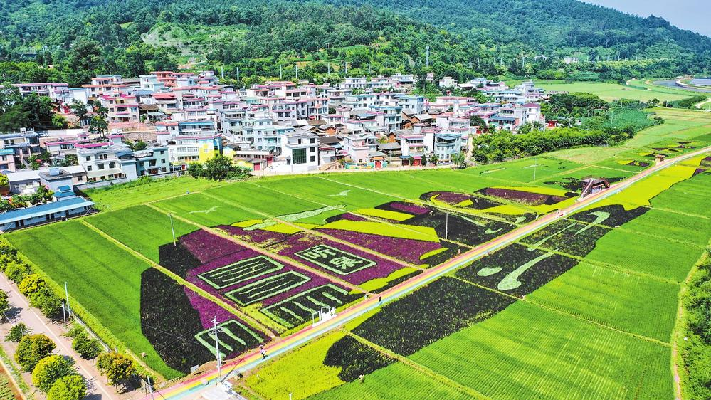 進(jìn)入核桃箐村,沿著村中石板小徑一路向下走,彩色稻田呈緩梯狀錯(cuò)落排列,以黑、紅、白等五色水稻拼接而成的彝族少女、大象、蝴蝶等圖案映入眼簾。