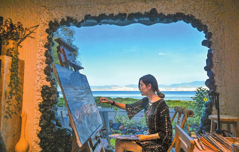 趙煥油畫藝術空間門前開闊的水域上,開出了一簇簇潔白晶瑩的海菜花。今天,趙煥的粉絲預約了油畫體驗課,趙煥坐在窗前邊畫邊等。畫室內(nèi),桌椅、陶罐、羽毛撣子,每一件物品都沾染上了顏料,連畫中的畫家也是衣裙、鬢角沾染上顏料時的模樣,門口有店主的簡介:青年油畫家趙煥,白族,國家一級美術師。