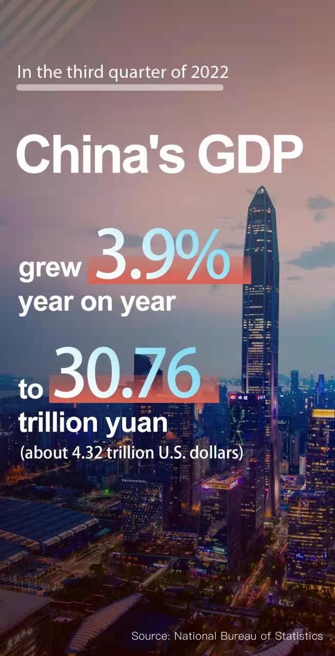 The country's gross domestic product (GDP) grew 3.9 percent year on year to 30.76 trillion yuan (about 4.32 trillion U.S. dollars) in the third quarter, 3.5 percentage points higher than that in the second quarter, data from the National Bureau of Statistics (NBS) showed Monday.