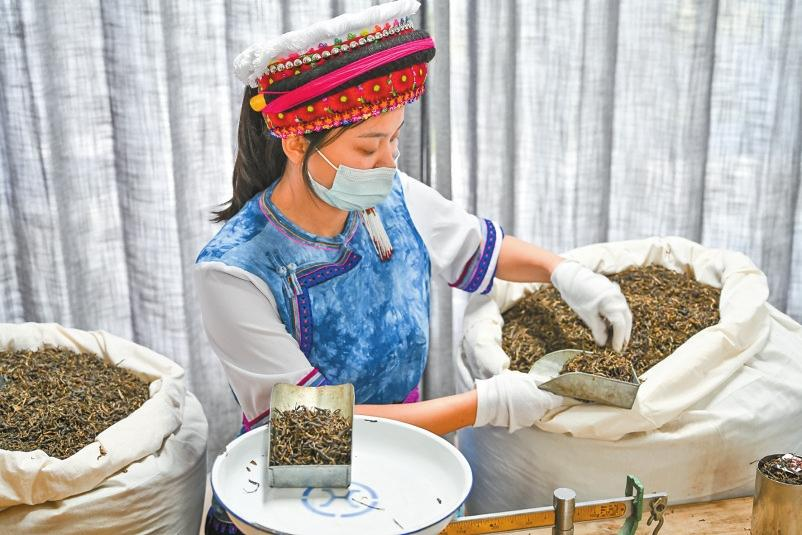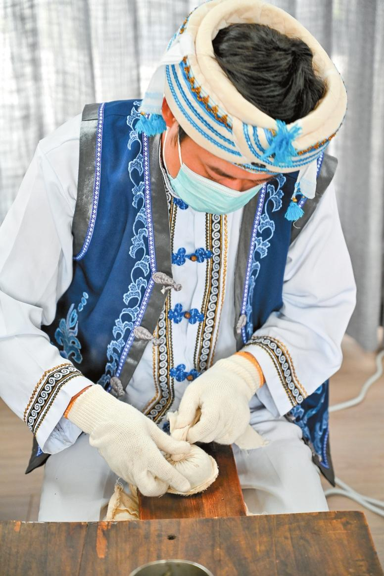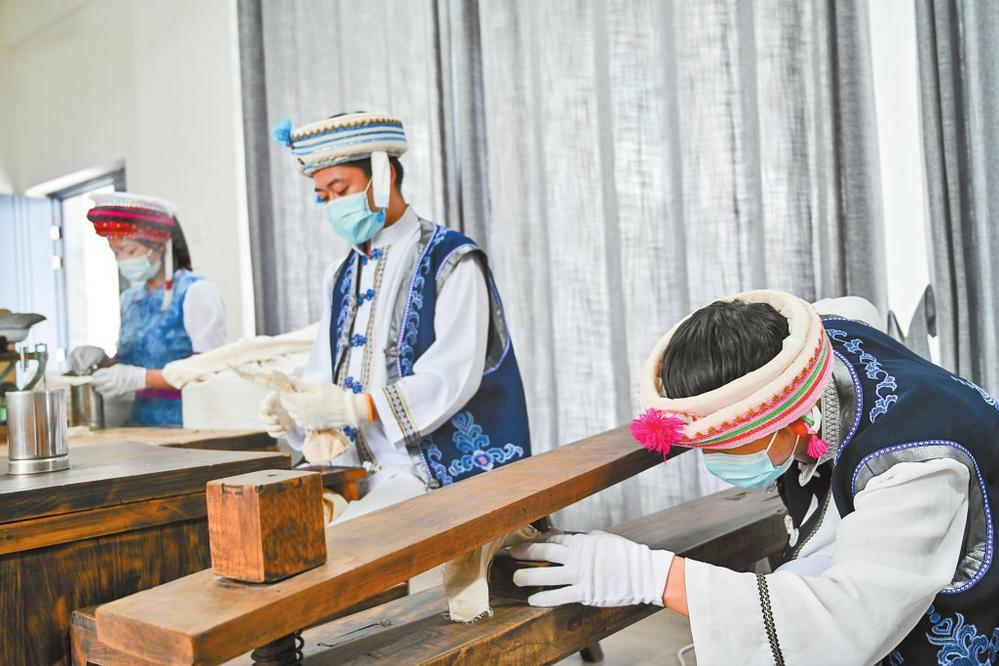 9月22日上午,下關(guān)沱茶博物館,3位沱茶制作技藝傳承人身著白族服裝,演示下關(guān)沱茶制作技藝:
