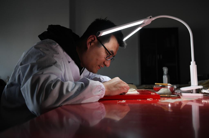 10月20日,在安徽中醫(yī)藥大學(xué)圖書館古籍部,古籍修復(fù)師茆可人在進(jìn)行古籍修復(fù)。新華社記者 張端 攝