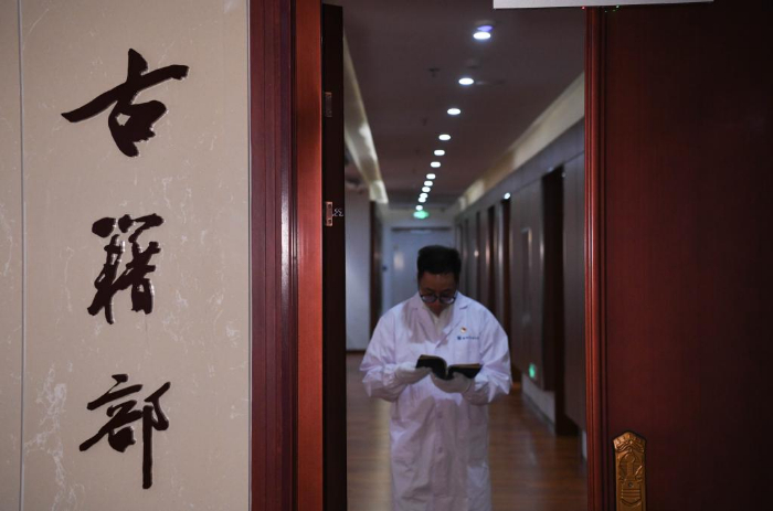 10月20日,在安徽中醫(yī)藥大學(xué)圖書館,古籍部主任鄧勇取出待修復(fù)的古籍。新華社記者 張端 攝
