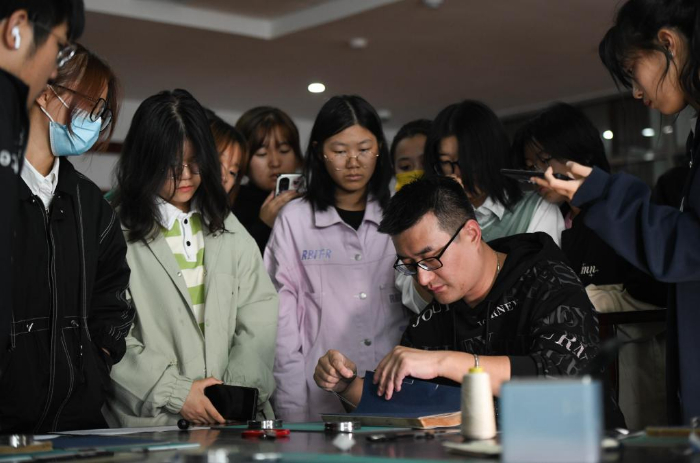 10月20日,在安徽中醫(yī)藥大學(xué)圖書館古籍部,古籍修復(fù)師茆可人教學(xué)生裝訂古籍。新華社記者 張端 攝