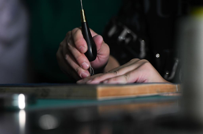 10月20日,在安徽中醫(yī)藥大學(xué)圖書館古籍部,古籍修復(fù)師茆可人在裝訂古籍。新華社記者 張端 攝