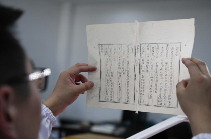 10月20日,安徽中醫(yī)藥大學(xué)圖書館古籍部主任鄧勇查看中醫(yī)古籍。新華社記者 張端 攝