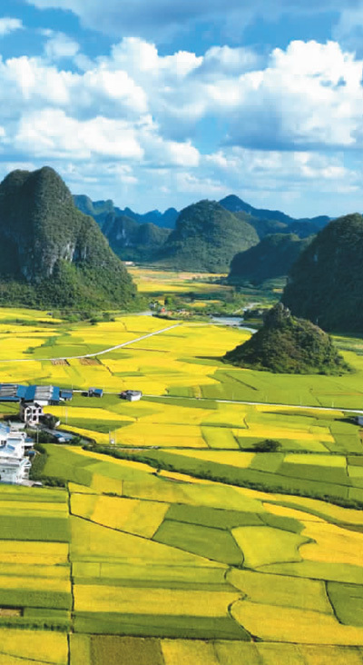 金秋時(shí)節(jié),地處祖國西南邊陲的廣西壯族自治區(qū)靖西市單季晚水稻陸續(xù)進(jìn)入成熟收割期,金黃的稻田為大地披上一層金裝。圖為靖西市化峒鎮(zhèn)三友村稻田航拍圖。鄭 壹 覃蔚峰攝影報(bào)道