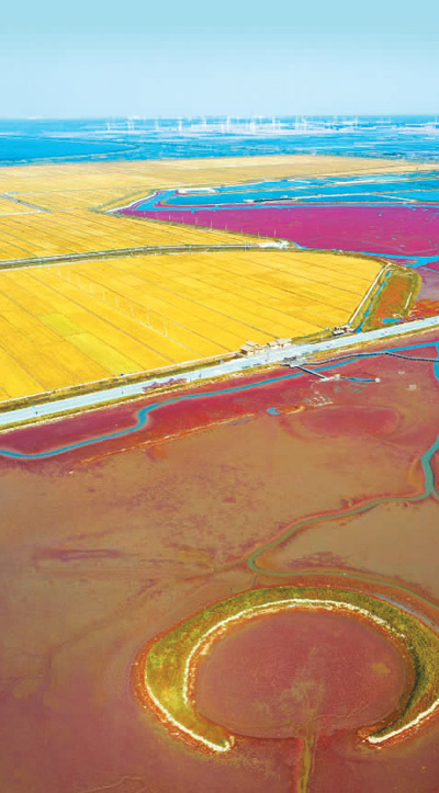 眼下,作為遼寧省水稻主產(chǎn)區(qū)的盤錦地區(qū)水稻已經(jīng)進(jìn)入收割階段。圖為遼寧省盤錦市大洼區(qū)金黃色的稻田與長滿紅色堿蓬草的海灘,紅色與黃色相互映襯,色彩斑斕。呂文正攝(人民視覺)