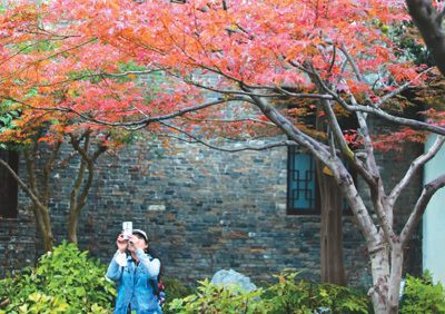 江蘇省揚(yáng)州市何園景區(qū)的楓葉漸紅,隨風(fēng)搖曳,吸引了游客前來觀賞。圖為一名游客在何園景區(qū)賞楓拍照。孟德龍攝(人民視覺)