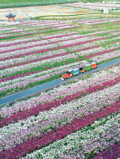 在浙江省東陽市南馬鎮(zhèn)花園村現(xiàn)代農(nóng)業(yè)生態(tài)園里,一輛小火車穿梭在五彩波斯菊湖海中,呈現(xiàn)出一幅美麗鄉(xiāng)村生態(tài)畫卷。包康軒攝(人民視覺)