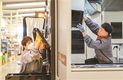 在山東省榮成市一家房車制造企業(yè)的生產(chǎn)車間內(nèi),工人們開足馬力趕制房車訂單。李信君攝(人民圖片)